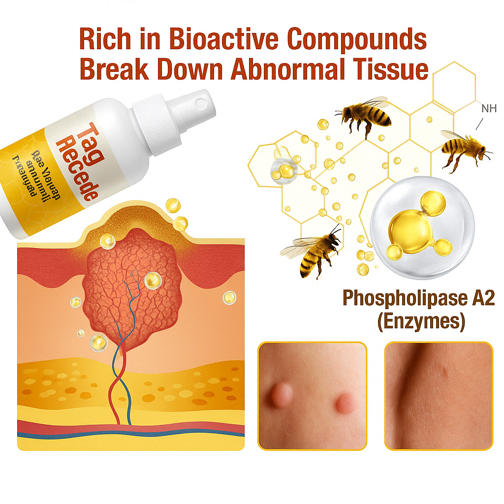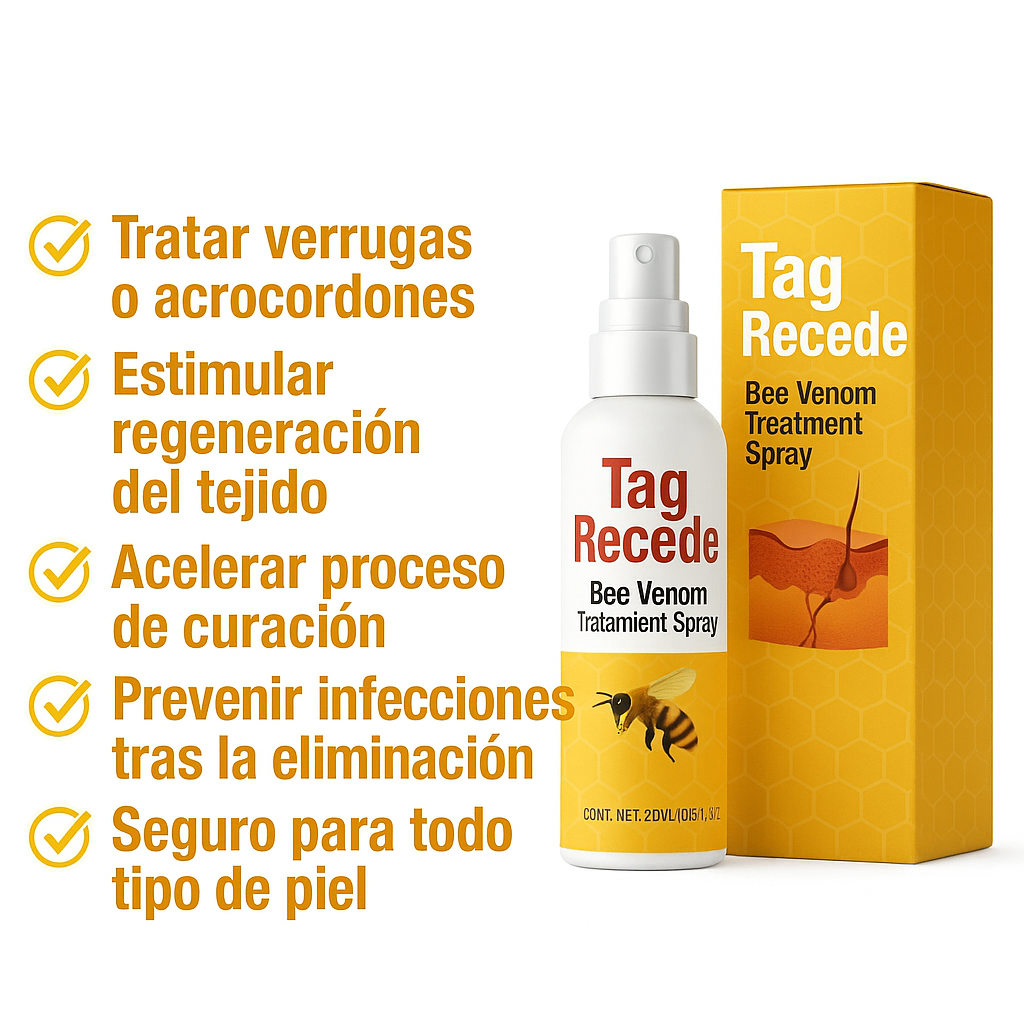 El spray de tratamiento TagRecede es la solución que aprovecha las potentes propiedades del veneno de abeja para tratar de manera eficaz verrugas, lunares y manchas . Esta fórmula avanzada, enriquecida con compuestos activos extraídos del veneno de abeja, descompone suavemente los crecimientos no deseados.